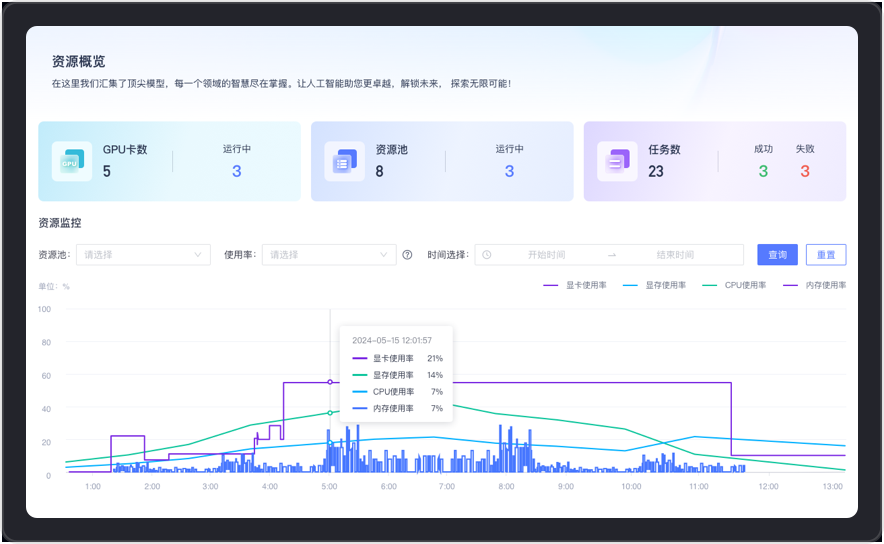 全面覆盖了GPU卡、资源池和任务级别的性能和状态监控,实时追踪监控资源池的使用情况,为系统健康和性能优化提供详尽的数据支持。支持GPU虚拟化、多机多卡并行训练,满足应用级别的算力管理。