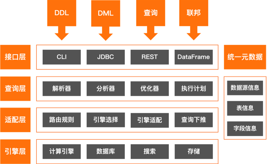 基于统一引擎技术和统一元数据系统,支持跨引擎的联邦查询引擎,在数据中心内为客户打通数据,将分散的数据以高性价比的方式实现融合计算和分析。减少不必要的数据传输和ETL,提升分析效率。